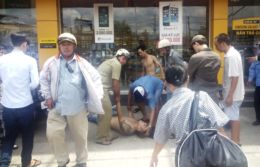 Tưởng tài xế bị cướp, mọi người chạy đến can thiệp thì phát hiện nam thanh niên trên có biểu hiện ngáo đá, la hét, đấm đá loạn xạ. Người dân khuyên bảo và đưa thanh niên này vào một quán nước ven đường.