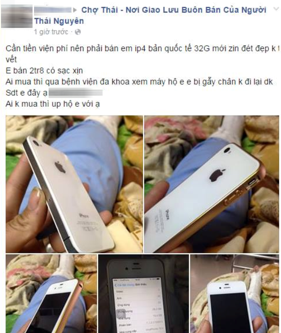 Ngày 23/12 trên diễn đàn mua bán của người Thái Nguyên, thành viên có tên T.V đã chia sẻ các hình ảnh anh nằm trong bệnh viện, chân băng bó vết thương, đăng bán một chiếc iPhone để có tiền trả viện phí. Nội dung chia sẻ như sau: "Cần tiền viện phí nên phải bán chiếc iPhone 4 bản quốc tế 32g, mới đẹp không tì vết. Em bán 2,8 triệu đồng. Ai mua thì qua bệnh viện đa khoa xem máy hộ, em bị gãy chân nên không đi lại được".