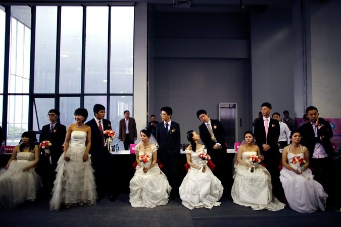 | Đám cưới tập thể tại Thượng Hải - một phần trong sự kiện khích lệ những người độc thân lập gia đình. |