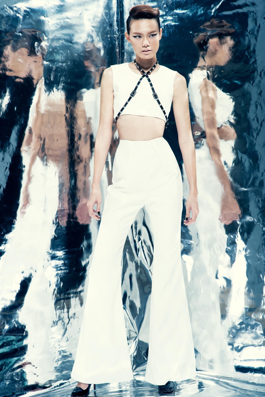 | Áo crop-top cùng quần ống loe phối ăn nhập, tông trắng thanh lịch và nền nã. |