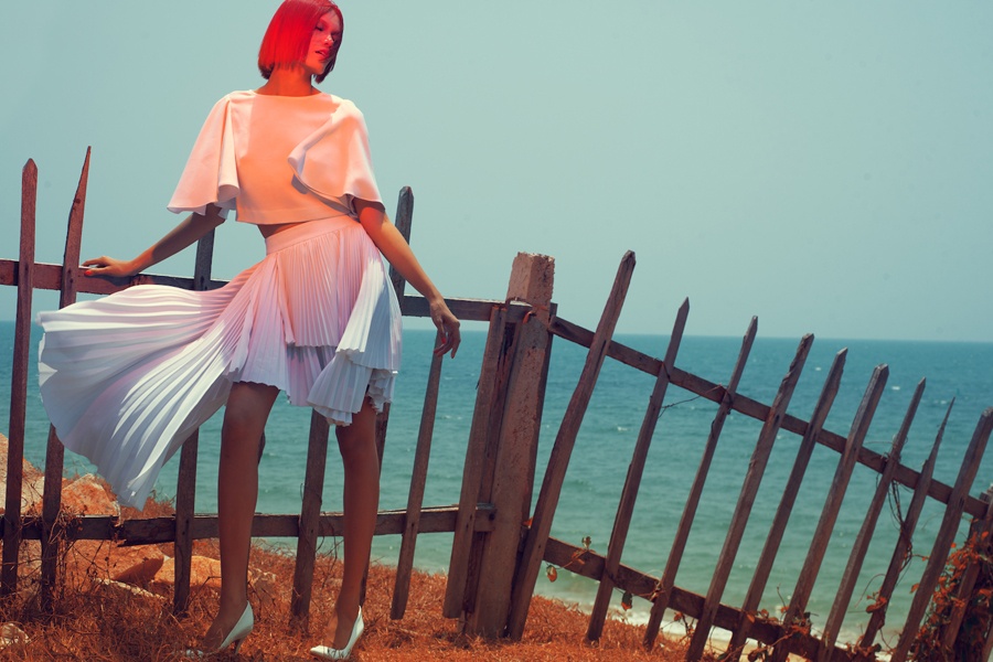 | Kiểu váy xếp ly vạt ngắn, dài đầy ngẫu hứng, phối ăn nhập cùng áo tay xòe nữ tính. |