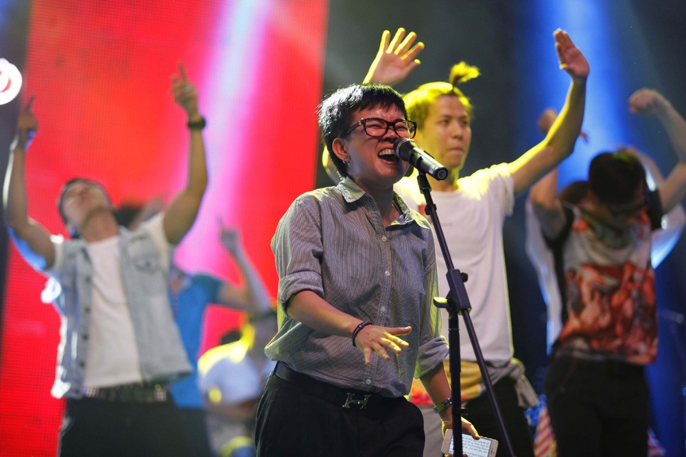 | Sau khi hoàn thành tiết mục của mình, cặp đôi ngồi nghỉ ngơi ngay trên sân khấu. Dù có bạn trai ngồi dưới hàng ghế khán giả nhưng nữ ca sĩ vẫn chụp ảnh tình tứ và thân mật của nam ca sĩ trẻ. |