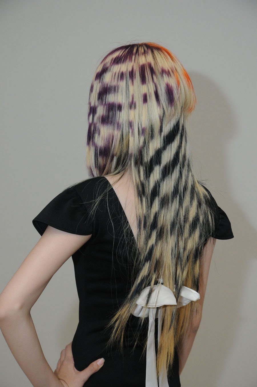 Một kiểu tóc ấn tượng với kiểu thắt dáng nơ to, kết hợp cùng trang phục cũng được làm từ tóc tự nhiên.