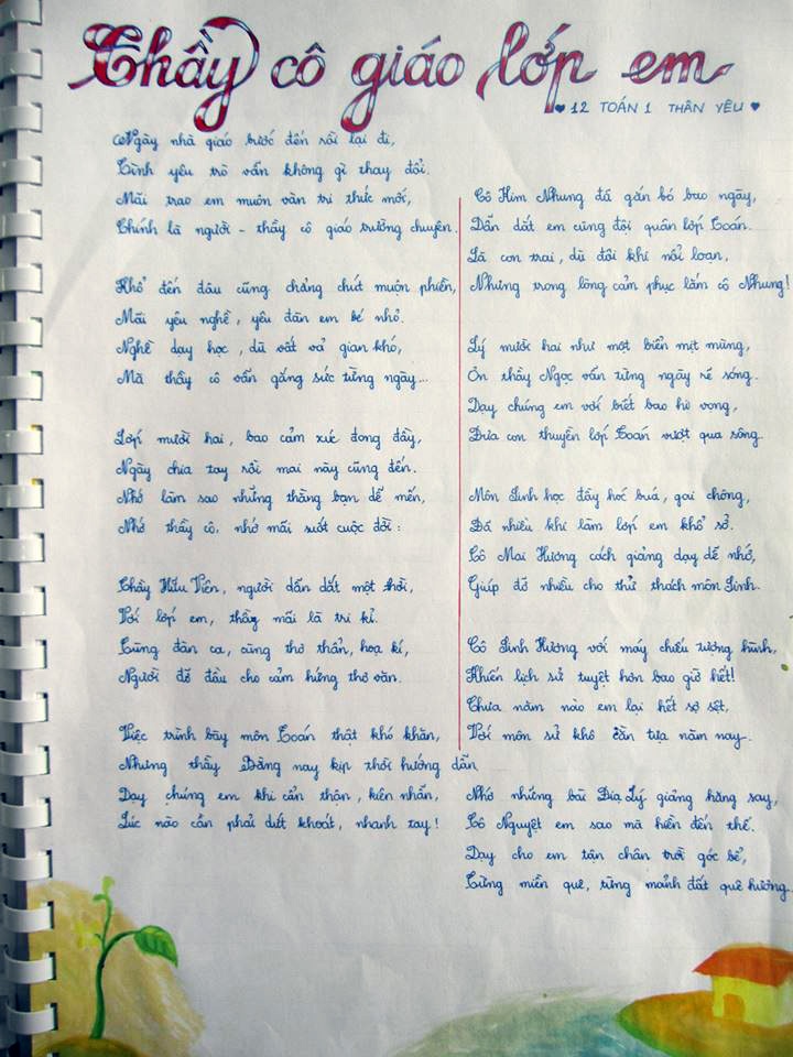 Nếu được lựa chọn tên gọi dí dỏm cho bài thơ này, Đạt cho biết sẽ đặt là 12 sư phụ của lớp tôi. Bài thơ được viết bởi nét chữ rất đẹp và đăng trong tập san của lớp nhân ngày 20/11.