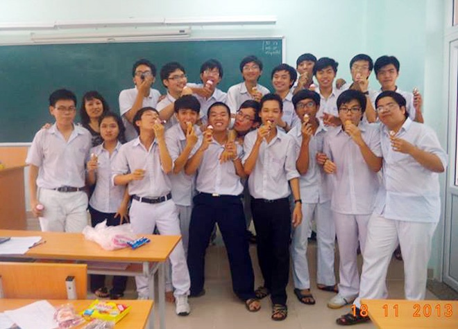 | Lớp 12 chuyên Toán trường THPT chuyên Lê Quý Đôn của, Vũng Tàu, Phạm Quốc Đạt đang theo học, được cô giáo chủ nhiệm... khao kem vì đạt giải khuyến khích cuộc thi làm tập san nhân ngày 20/11. |