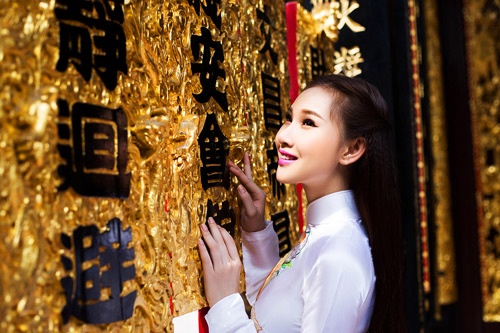 Nữ hoàng trang sức chọn trang phục dân tộc đi lễ chùa trong những ngày đầu năm mới, thể hiện nét đẹp truyền thống văn hóa của người Việt.