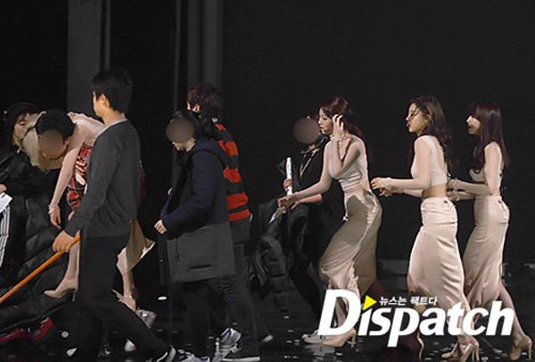 | Khi đang hát và nhảy cùng nhóm, Hyeri bất ngờ ngã gục trên sân khấu, 3 thành viên Sojin, Minah và Yura dừng lại để kiểm tra tình trạng em út. |