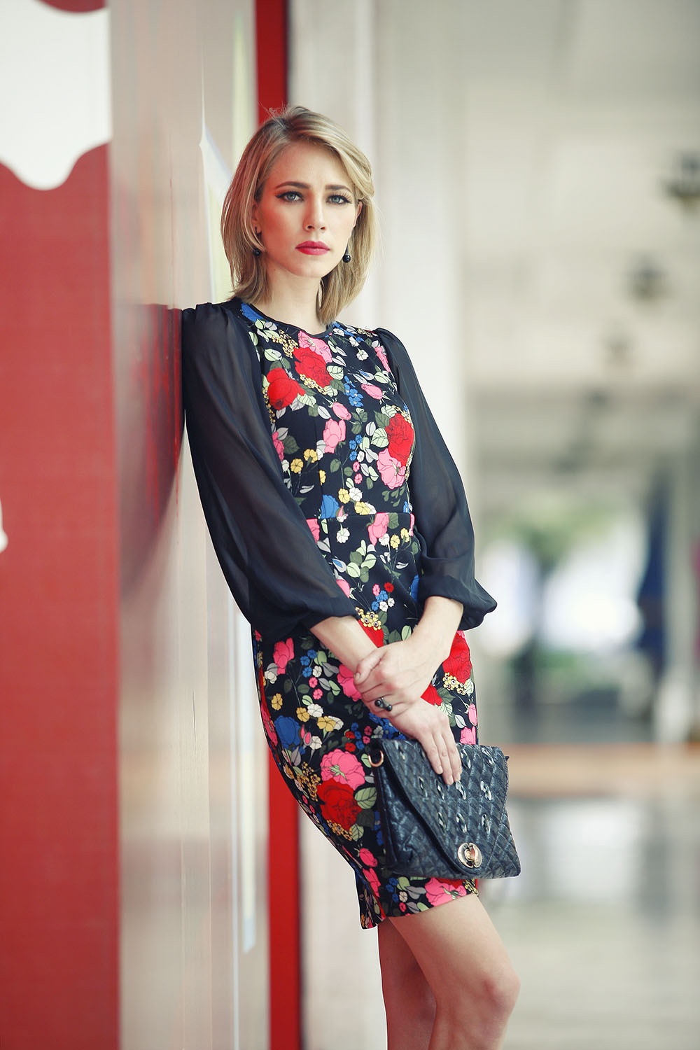 | Đốm lửa hồng: Sắc hồng của hoa nơi chân váy, chút nhấn hồng nơi eo, quanh cổ, nư một nụ tầm xuân giữa mùa đông giá rét. |
