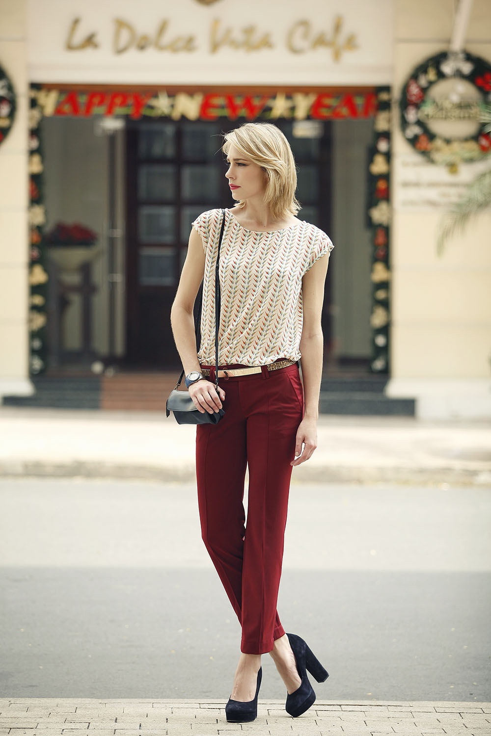 | Màu mận chín: Đỏ thẫm cũng là một "hot color" của bảng màu thu đông năm nay. Dáng quần Skinny năng động kết hợp với áo suôn rộng cũng là một gợi ý tuyệt vời. Photo: Quang Giang. Model: Elly. Nhà thiết kế: Sương Nguyễn. Trang phục: Chuồn Chuồn Ớt |