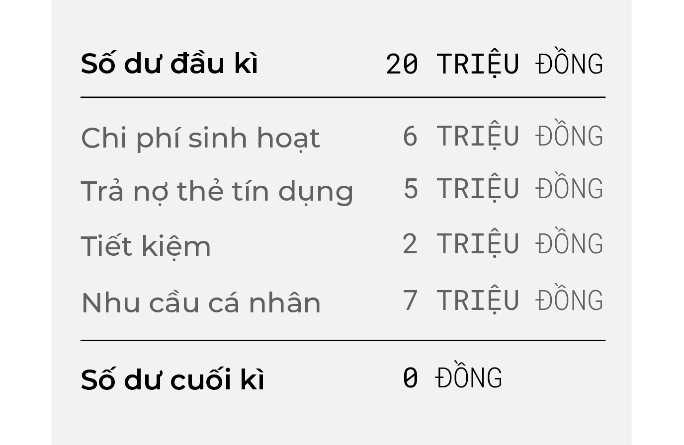 Giả sử, tổng thu nhập của bạn trong tháng này là 20 triệu đồng và bạn có 4 nhóm lớn cần chi tiêu gồm chi phí sinh hoạt, trả nợ thẻ tín dụng, tiết kiệm và nhu cầu cá nhân.