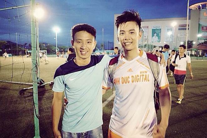 | Thầy Hòa và "running man" Vũ Xuân Tiến trong một trận đá bóng. Ảnh: NVCC. |