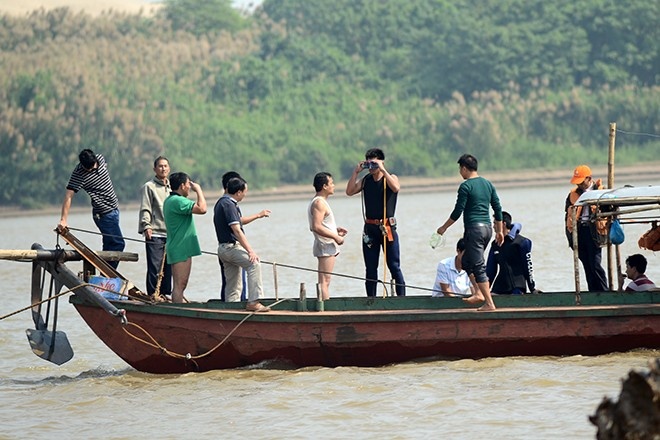 | Các thầy giáo và sinh viên khoa Lặn trường Giao thông vận tải tham gia tìm kiếm xác chị Huyền. Ảnh: Tuấn Mark. |