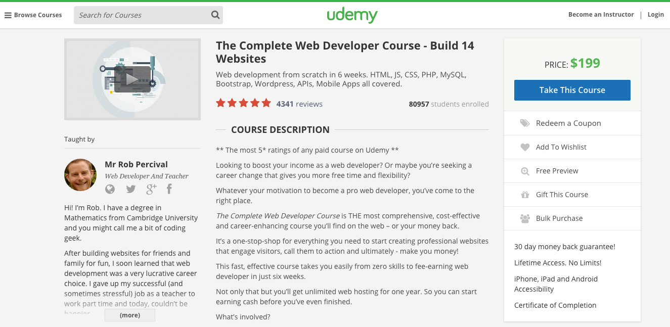 | Khóa học đầy đủ về phát triển website của Rob Percival trên trang giáo dục trực tuyến Udemy. |