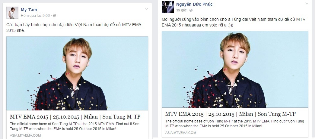 Ngày 11/10, ca sĩ Mỹ Tâm bất ngờ đăng dòng trạng thái trên trang cá nhân kêu gọi fan hãy bình chọn cho nam ca sĩ Thái Bình mồ hôi rơi. Nữ ca sĩ chia sẻ: "Các bạn hãy bình chọn cho đại diện Việt Nam tham dự đề cử MTV EMA 2015 nhé". Ngay sau đó, học trò của cô tại Giọng hát Việt vừa qua cũng nhắn nhủ người hâm mộ: "Mọi người cùng vào bình chọn cho anh Tùng, đại diện Việt Nam tham dự đề cử MTV EMA 2015".