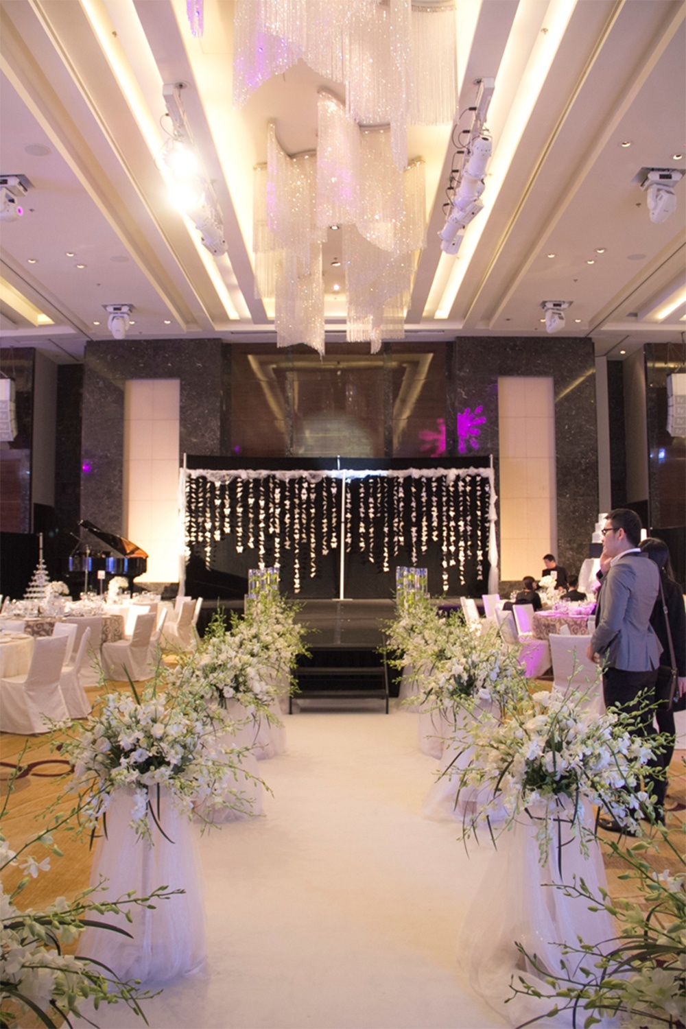 | Phòng đại tiệc rộng hơn 1.000m2 lung linh dưới suối đèn pha lê được trang trí theo tông màu trắng - xám thời thượng. |
