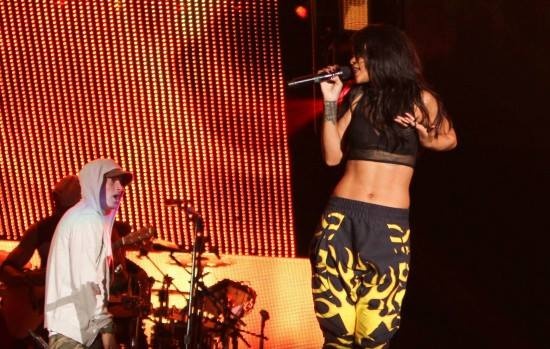 | Rihanna góp giọng trong một số bản hit đình đám của Eminem như Stan trên sân khấu. |