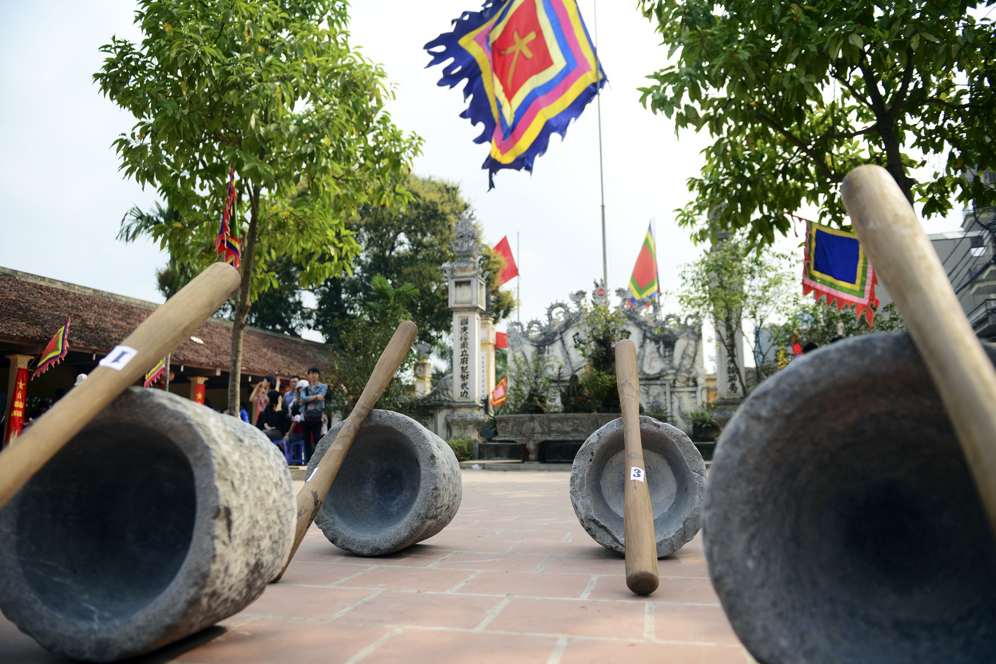 Bốn chiếc cối đá cùng chày giã thóc được đặt trước sân đình chờ tới giờ khai hội. Phong tục này diễn ra mỗi dịp xuân về với mục đích cầu chúc cho dân làng một năm mới no đủ, hạnh phúc, mọi nhà bình an.