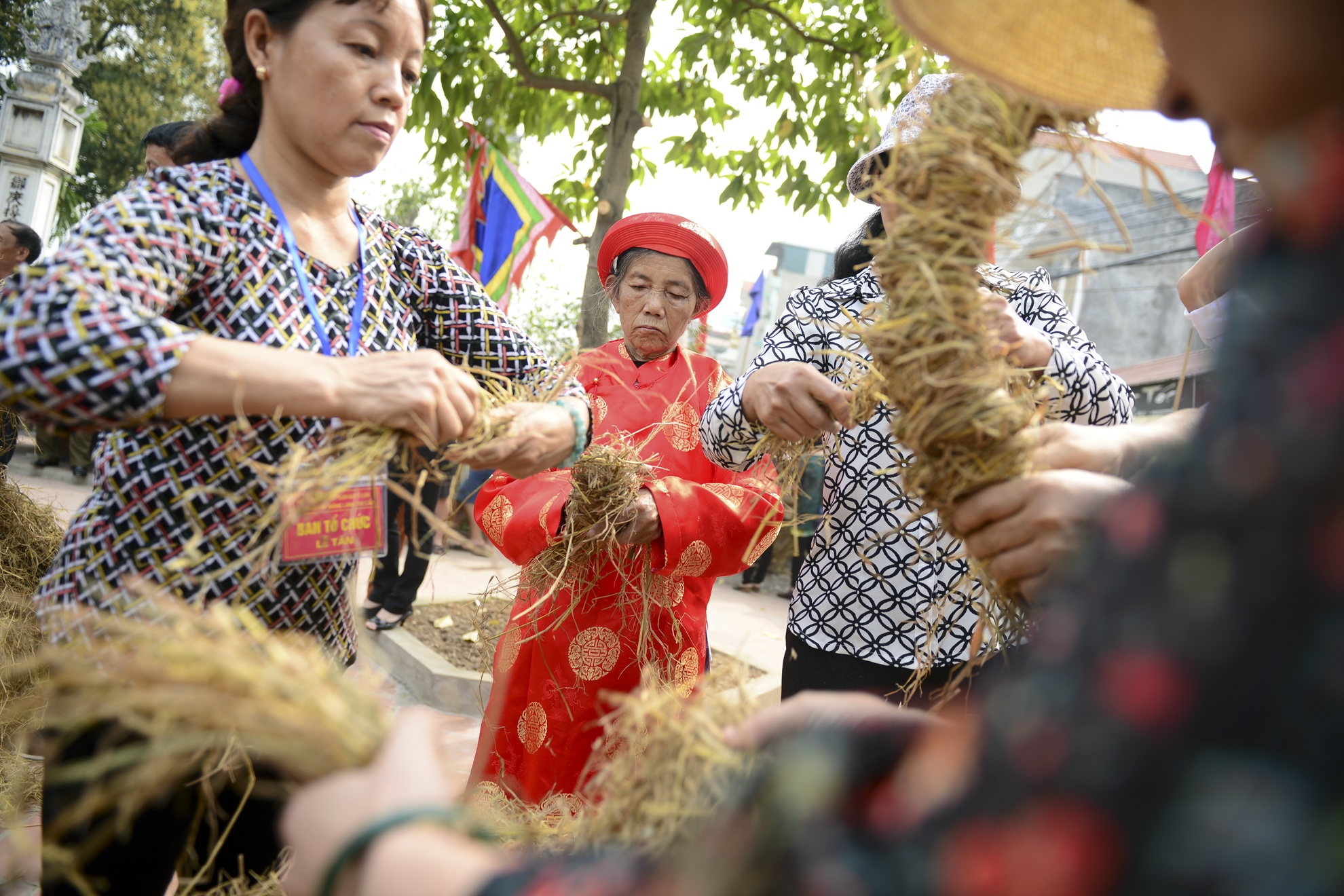 | Rơm được người dân chuyển ra sân đình. Lúc này (10h) mọi người bắt tay vào bện để chuẩn bị cho cuộc thi. |