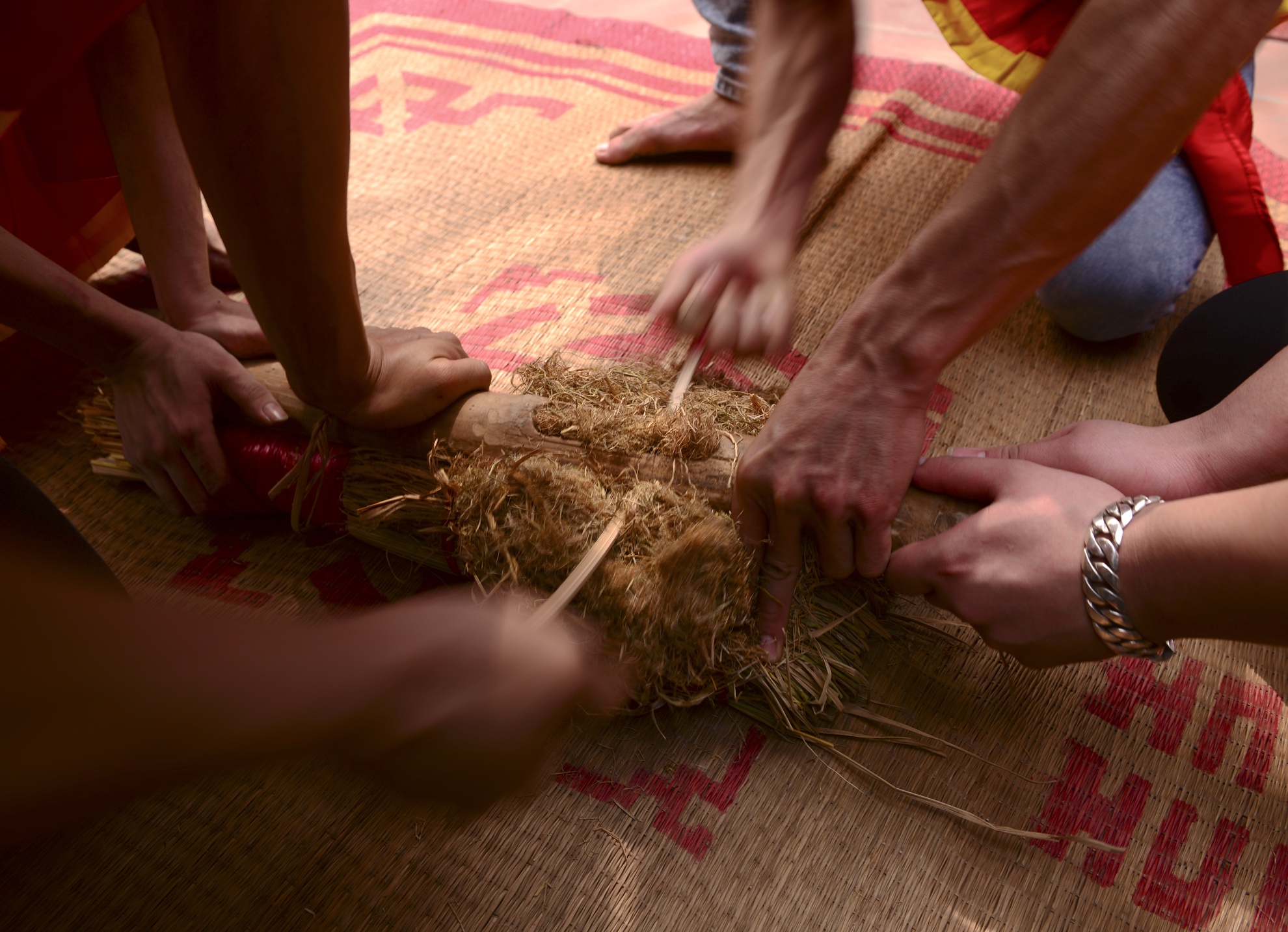 | Ma sát đủ nóng để tạo ra than trên thân tre, bén với bùi nhùi khô gây cháy. Người trưởng nhóm cầm bó rơm lên thổi mạnh để lửa bốc cháy to hơn. |