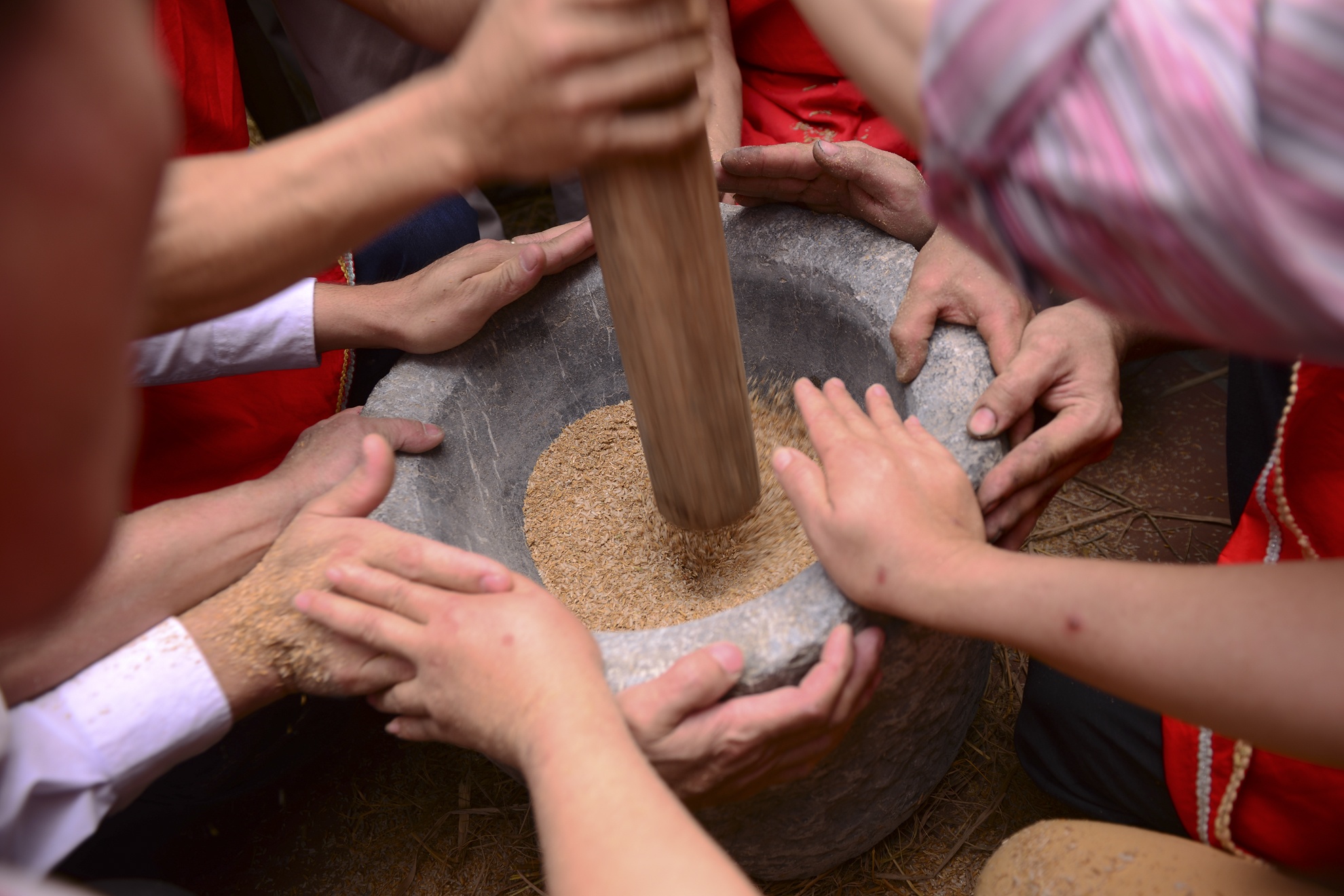 | Mỗi đội thi tài được phát một cân thóc, những người đàn ông trong đội dùng cối đá giã trên giế rơm. |