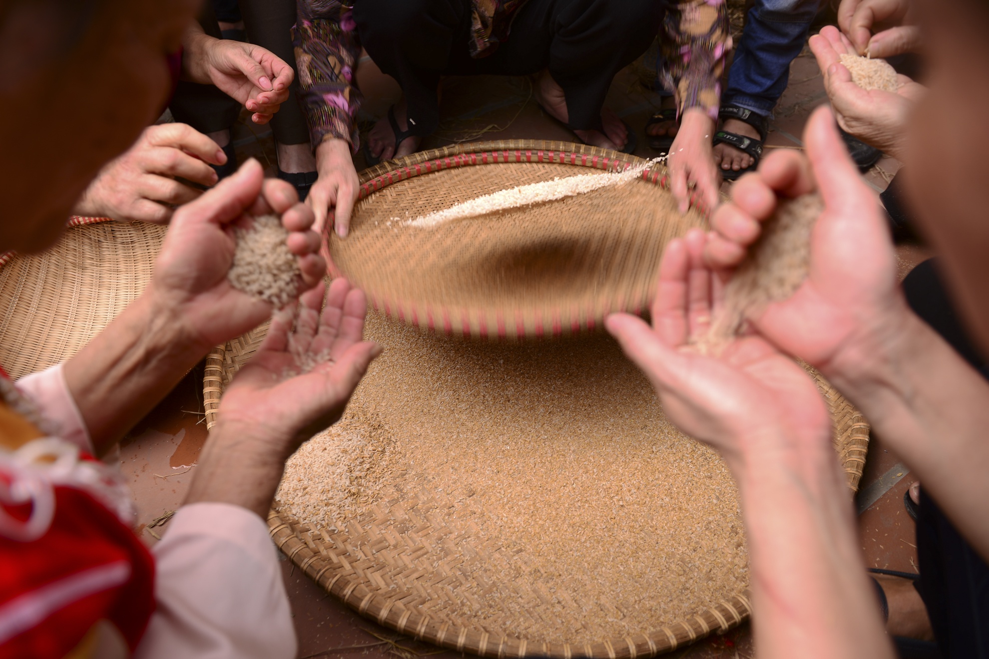 | Giã xong, thóc được chuyển sang cho các chị em phụ nữ khéo tay để sàng trấu và nhặt sạn. Không khí khẩn trương khiến sân đình lúc này rộn ràng, sôi động. |