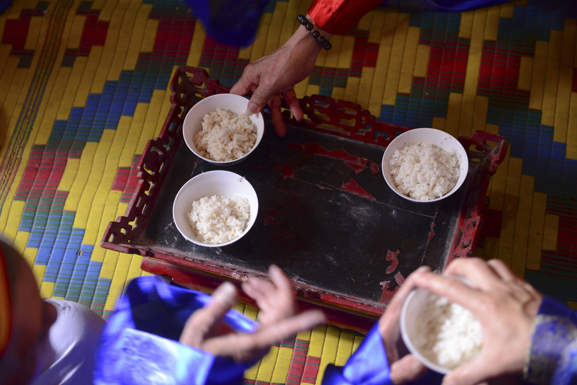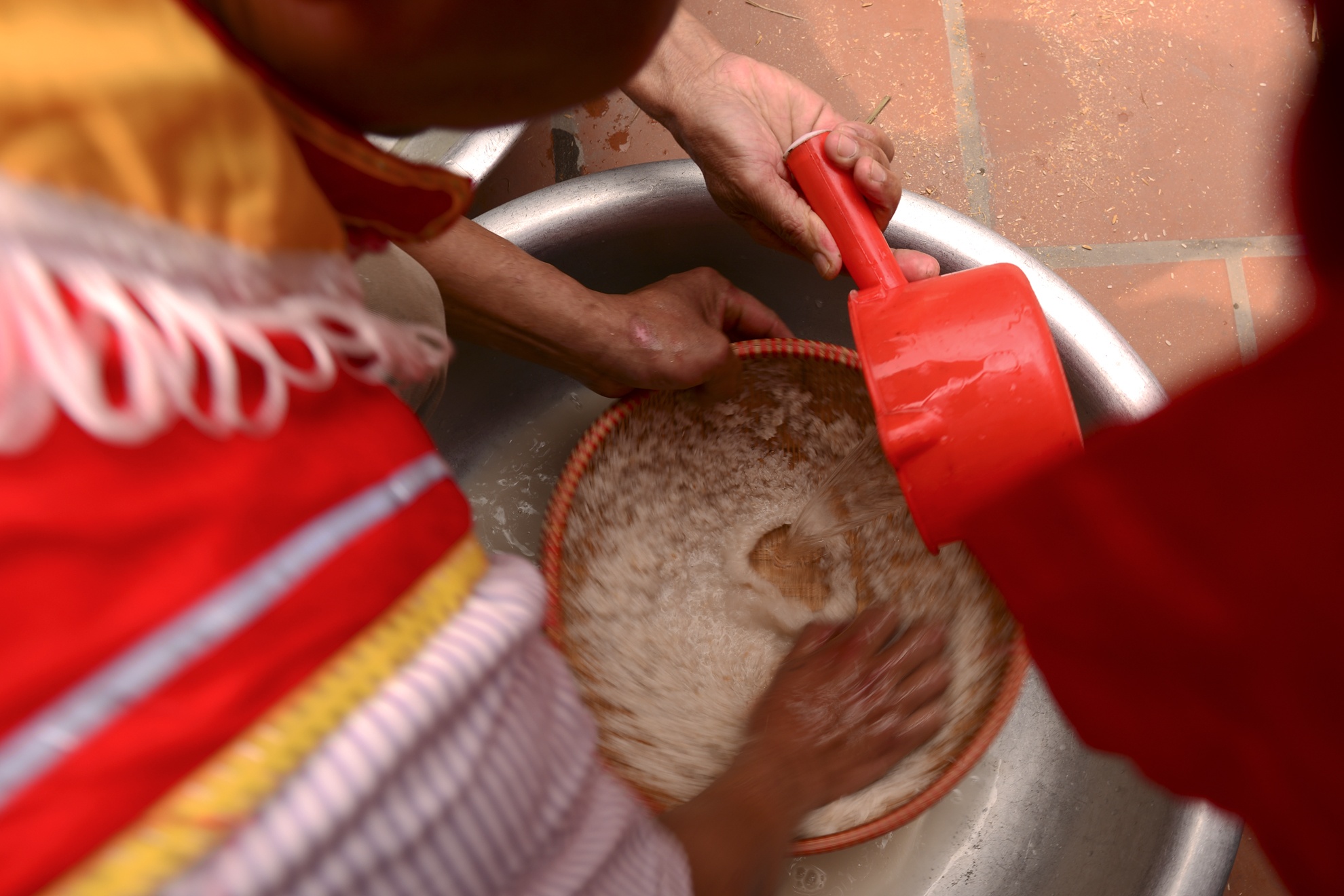 | Người khéo nhất trong hội được lựa chọn để vo gạo bằng nước lấy từ phần thi chạy, gạo vo xong phải thật sạch tấm và trắng tròn từng hạt. |