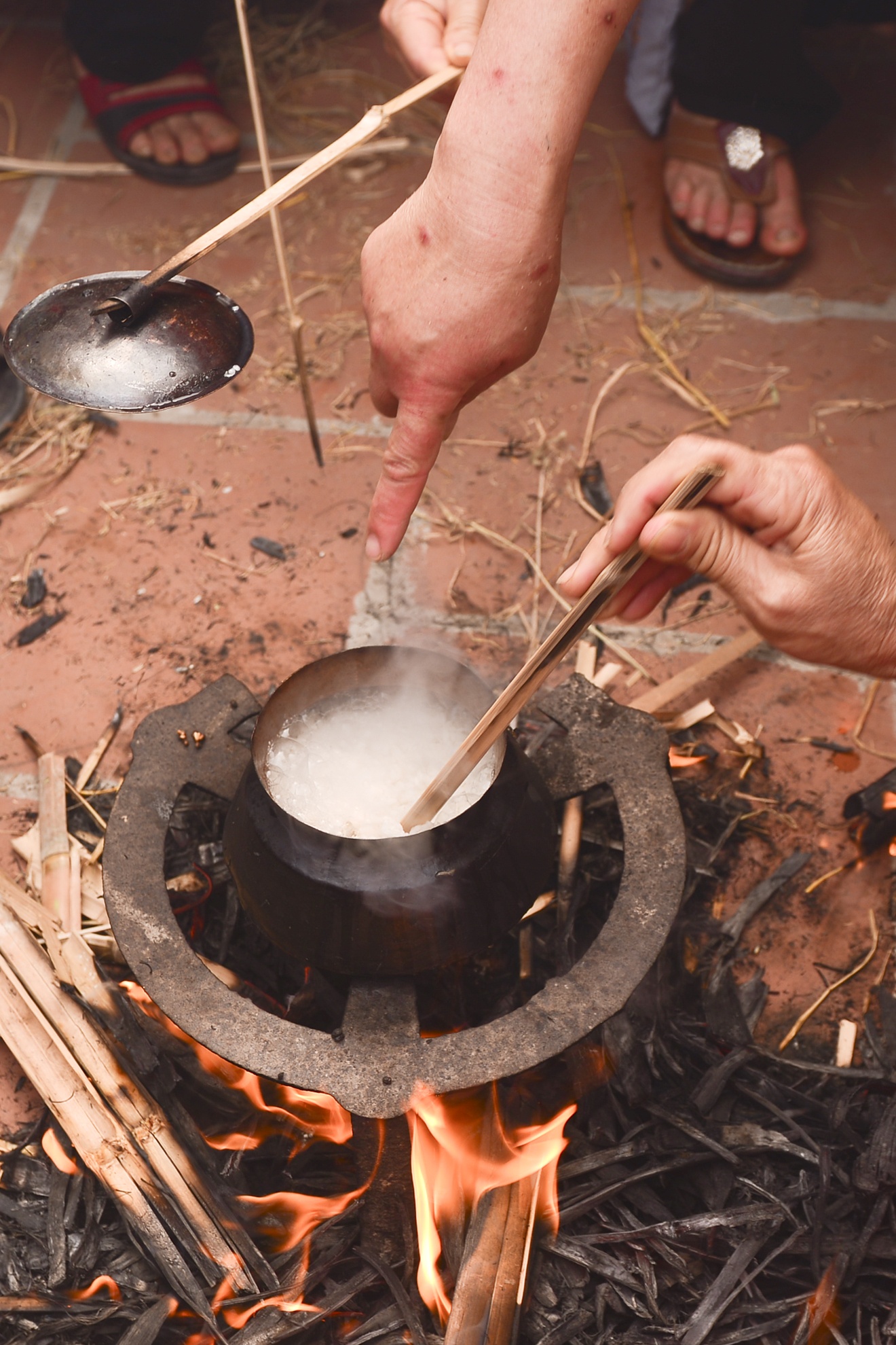 | Để kéo dài thời gian cho cơm chín, người phụ trách nồi cơm đốt vun nhiều đống tro rơm. |