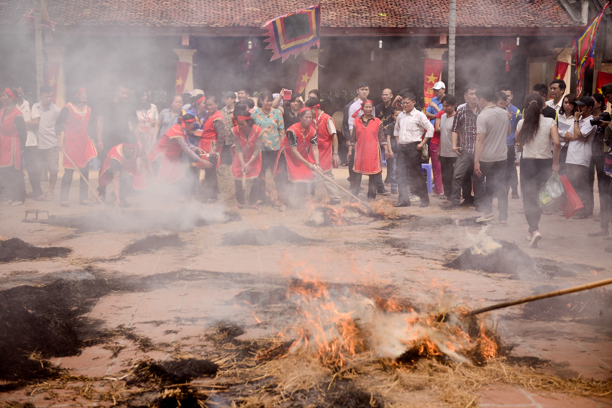 | 11h, sau tiếng trống khai hội của làng, phần thi kéo lửa diễn ra. Bộ kéo lửa là chiếc bùi nhùi đã chuẩn bị sẵn gồm rơm, đoạn tre đực già dùi sẵn những khe nhỏ và một que giang đánh lửa. 4 thanh niên trai tráng, hai người ghì chặt thanh tre già vào bó rơm, hai thanh niên còn lại dùng tay kéo thanh giang cưa nhanh và mạnh liên tục vào thanh tre để tạo ma sát. |