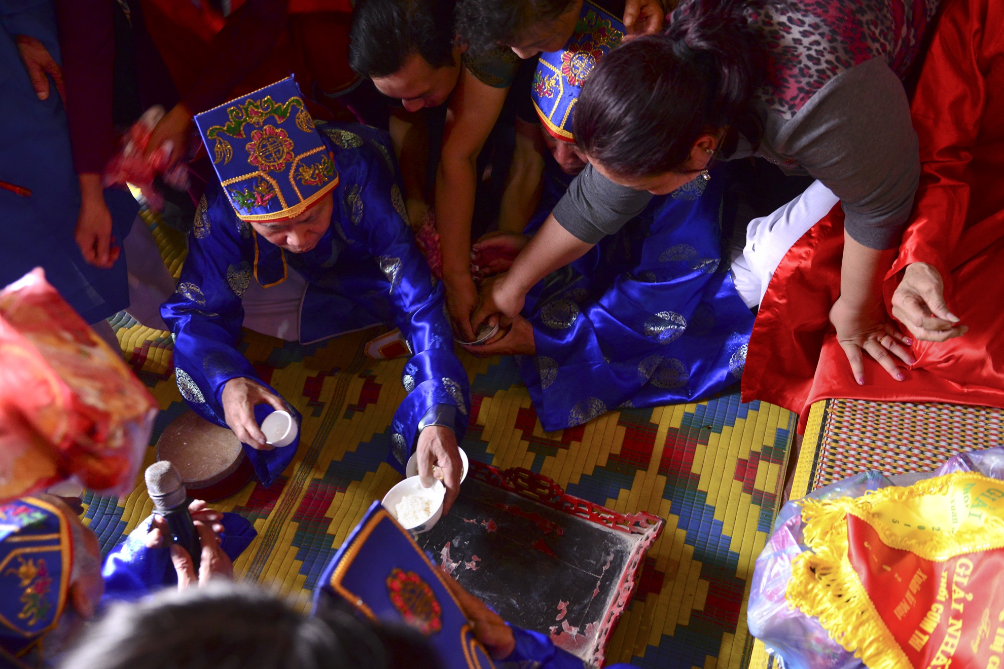 | Đúng 12h trưa, các vị bô lão trong làng đánh trống tìm cơm được vùi trong những đống tro tàn. |