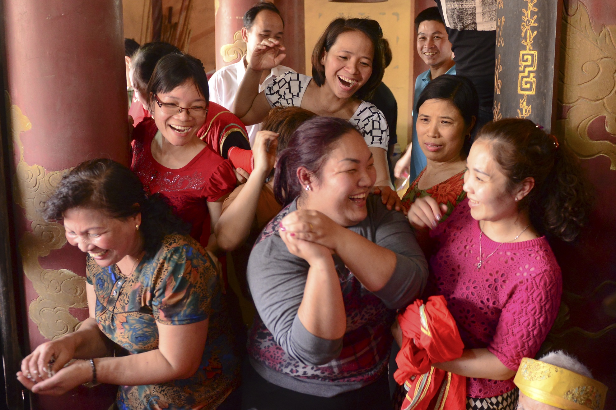 | Ngay sau khi công bố giải thưởng, thành viên các đội và người dân nhanh tay bốc cơm được thắp hương để lấy lộc đầu năm. |