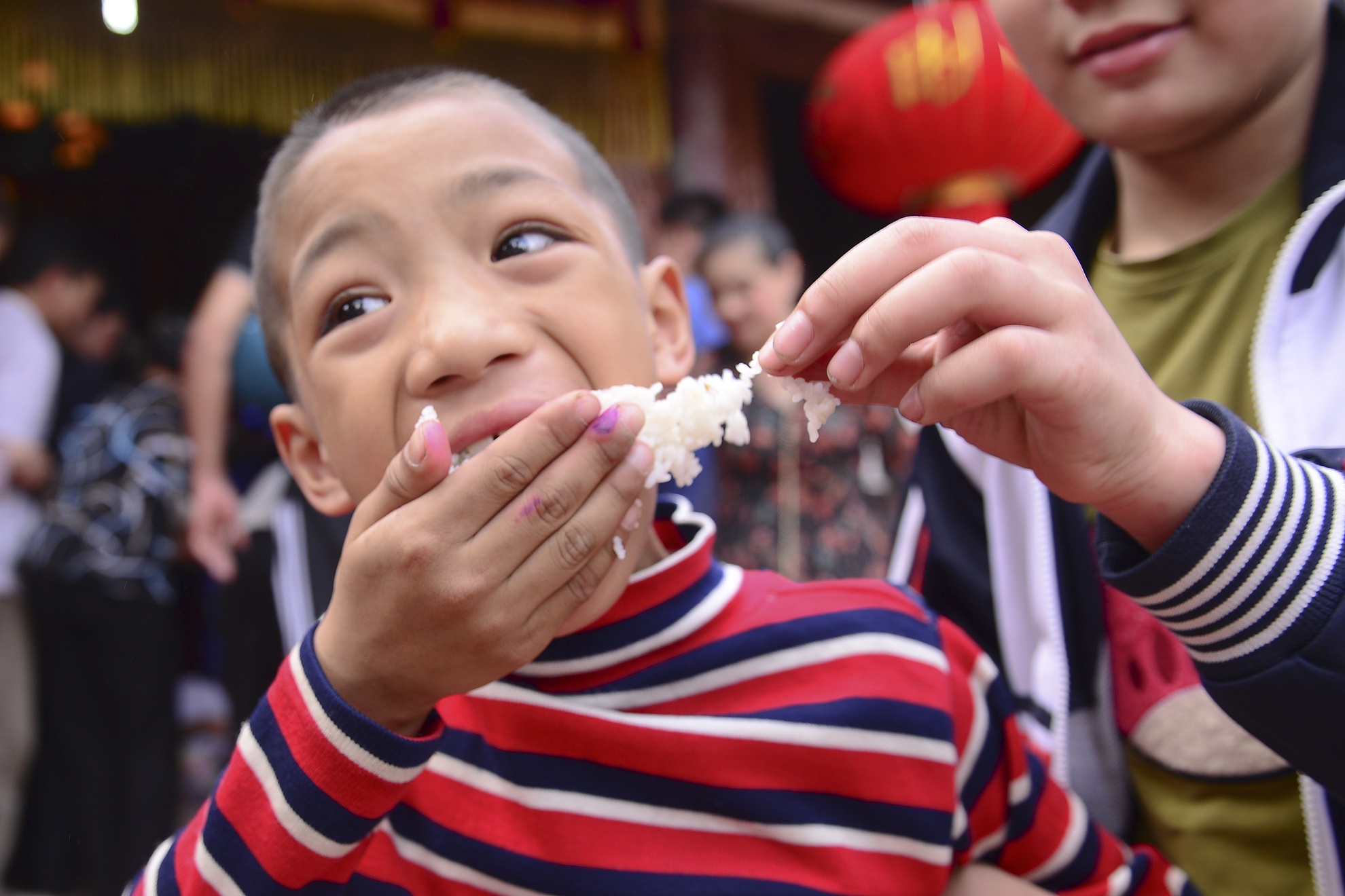 | Trẻ nhỏ thích thú thưởng thức những hạt cơm dẻo thơm ngày đầu năm mới. |