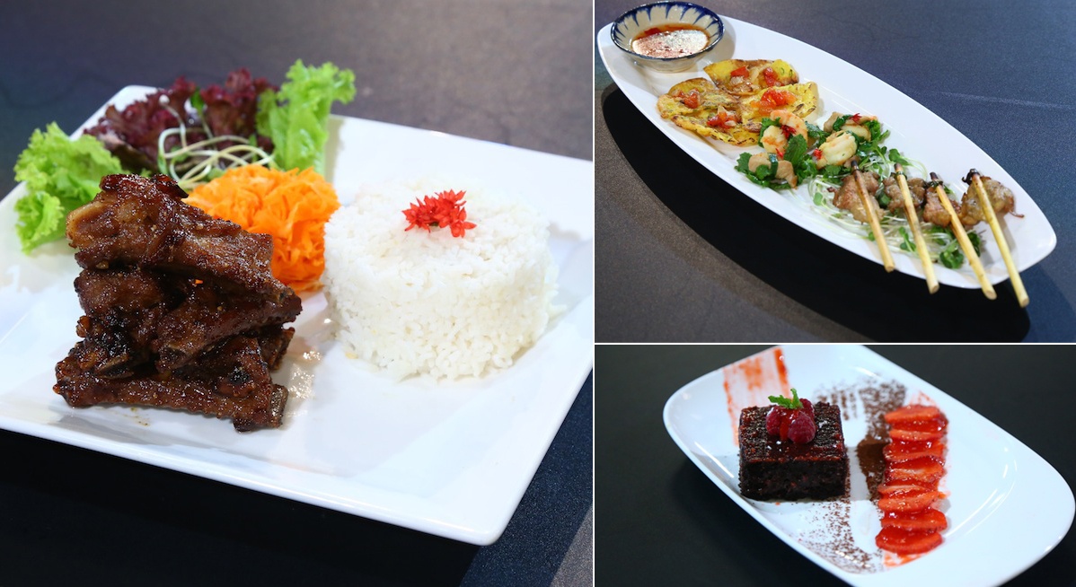 | Thực đơn của Phạm Tuyết: món khai vị gồm Thịt heo xiên đũa tre nướng, Tam hữu và Tacos bánh xèo kiểu Việt; món chính là Sườn kho và tráng miệng là Bánh Brownie. |