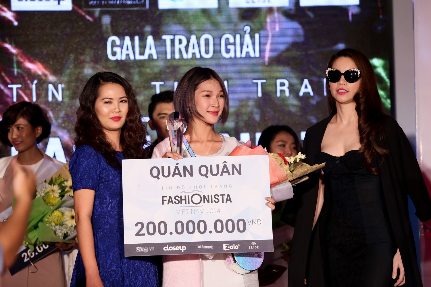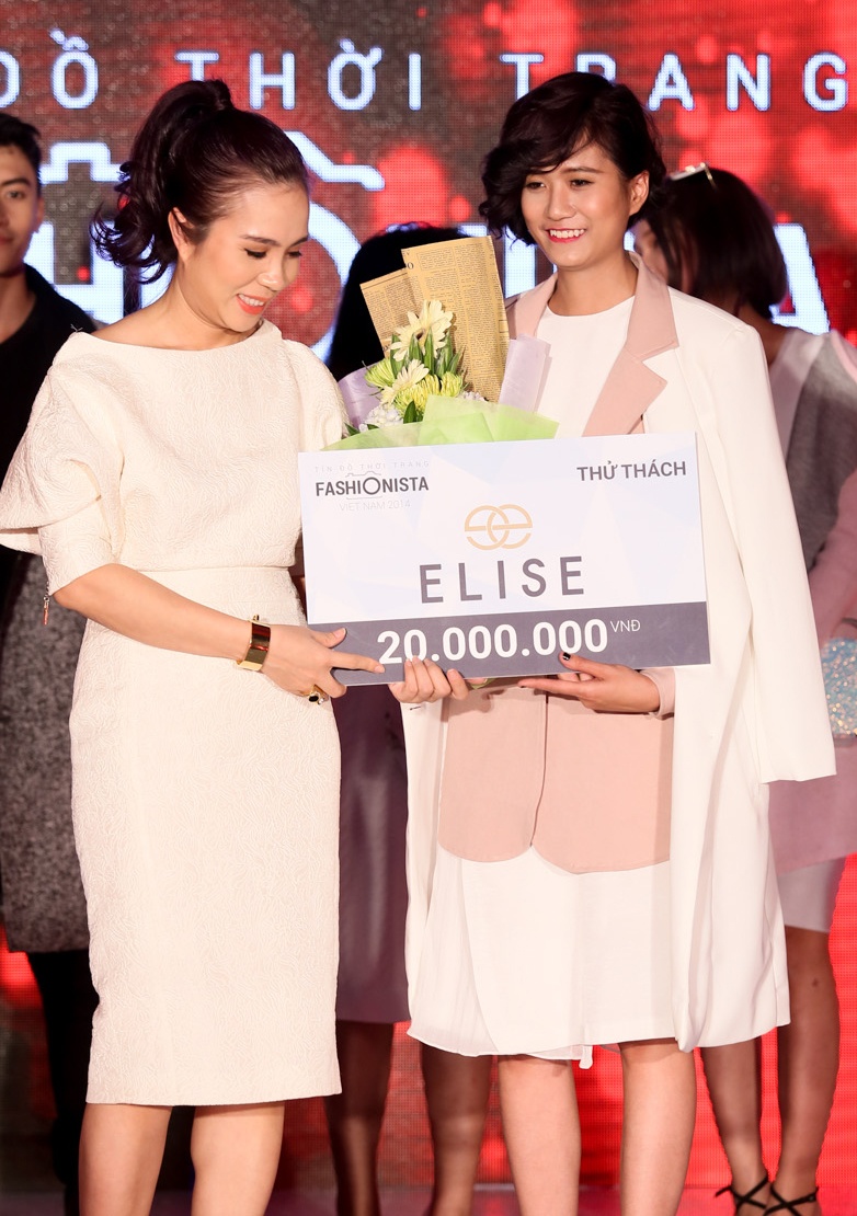 | Quán quân Fashionista 2014 thuộc về Diệp Linh Châu. Cô gái 20 tuổi đến từ Gia Lai nhận giải thưởng trị giá 200 triệu gồm 50 triệu tiền mặt, một chuyến đi đến Hàn Quốc và 100 triệu mua sắm từ nhãn hàng Elise. |