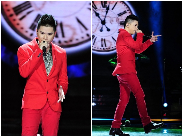 | Không có lợi thế ngoại hình so với nhiều bạn đồng hành, Hoàng Tôn khá thông minh trong cách chọn trang phục thể hiện cá tính hiện đại và năng động. Trong đêm liveshow đầu tiên, chàng trai của đội Mỹ Linh gây ấn tượng với bộ vest tông màu đỏ nổi bật. Bộ cánh ghi điểm nhờ đường cắt tinh tế và cách phối sơ mi phù hợp. Trước đó, Hoàng Tôn cũng nhận được khen tặng từ phía công chúng nhờ cách chọn trang phục hợp vóc dáng. Anh tự tin thể hiện ca khúc tự sáng tác Để em rời xa. |