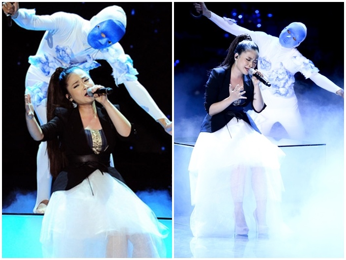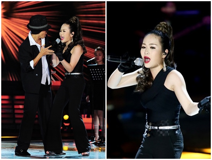 | Cô gái 17 tuổi Ngọc Trâm của đội Đàm Vĩnh Hưng khiến người xem bất ngờ khi thay đổi hình ảnh sang gợi cảm, nóng bỏng. Jumpsuit tông đen không chỉ giúp cô nổi bật trên sân khấu mà còn che lấp được lợi thế ngoại hình nhỏ và thiếu thon gọn.