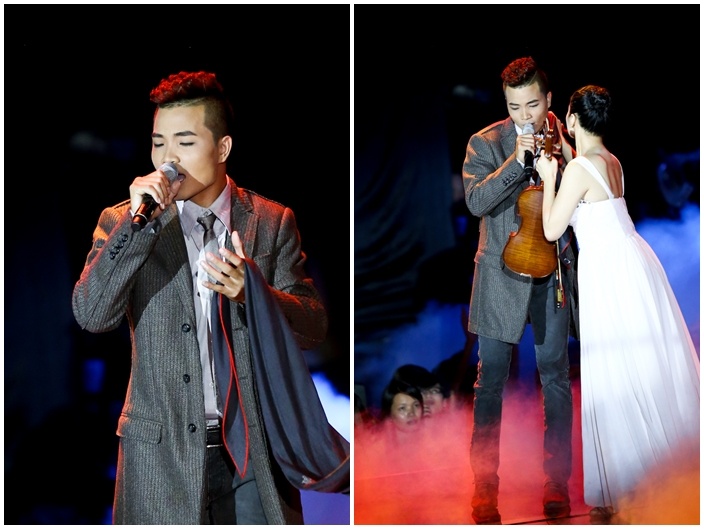 | Văn Viết gây ngạc nhiên khi rũ bỏ hình cá tính để chọn một phong cách quý ông lịch lãm khi thể hiện ca khúc Đường xa tuyết trắng. Áo vest dáng dài kết hợp cùng quần jeans, sơ mi đơn giản đã giúp hình ảnh của anh chững chạc hơn. Sự đổi mới này khiến chàng trai trong đội Đàm Vĩnh Hưng nhận được nhiều lời khen từ khán giả trẻ. |