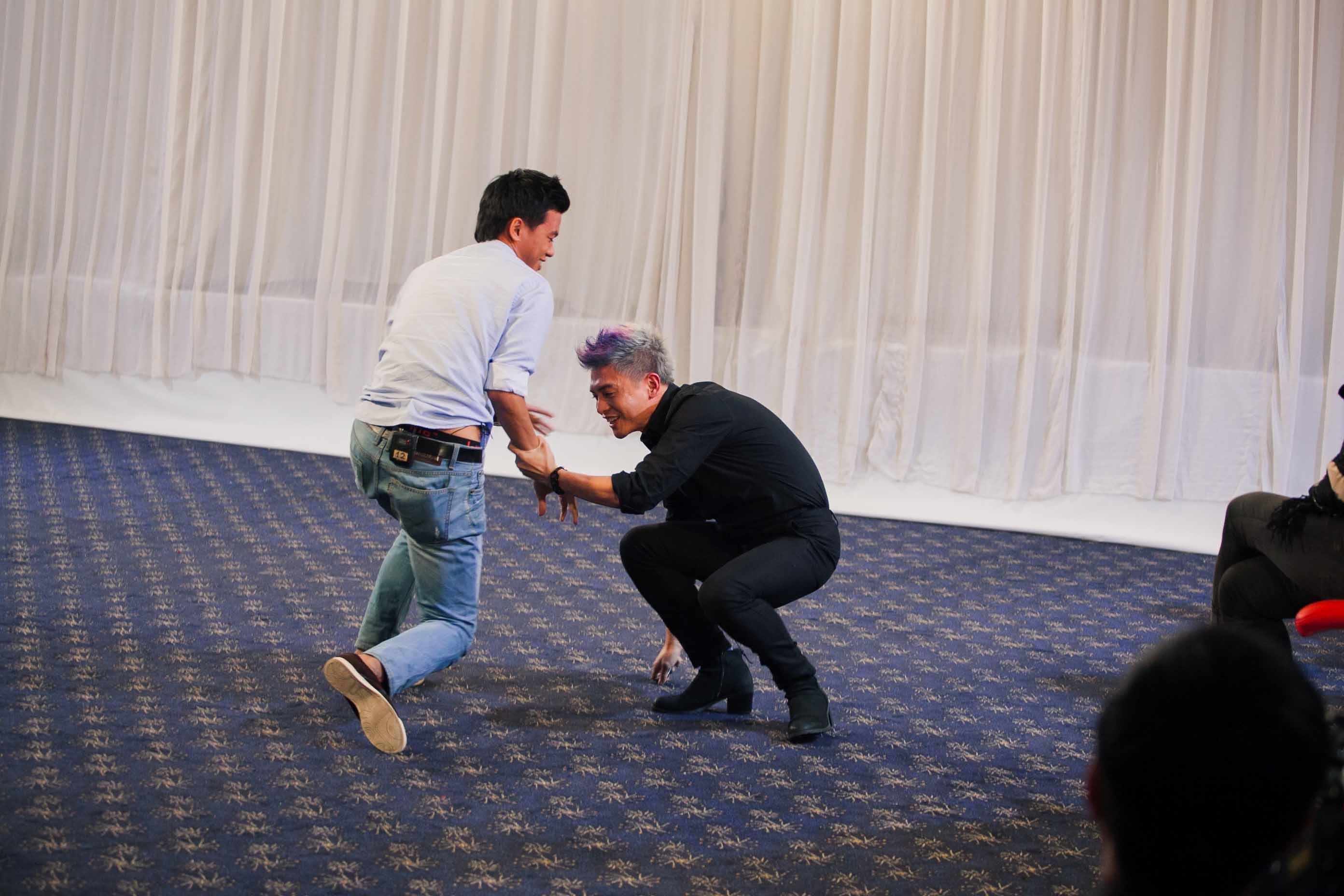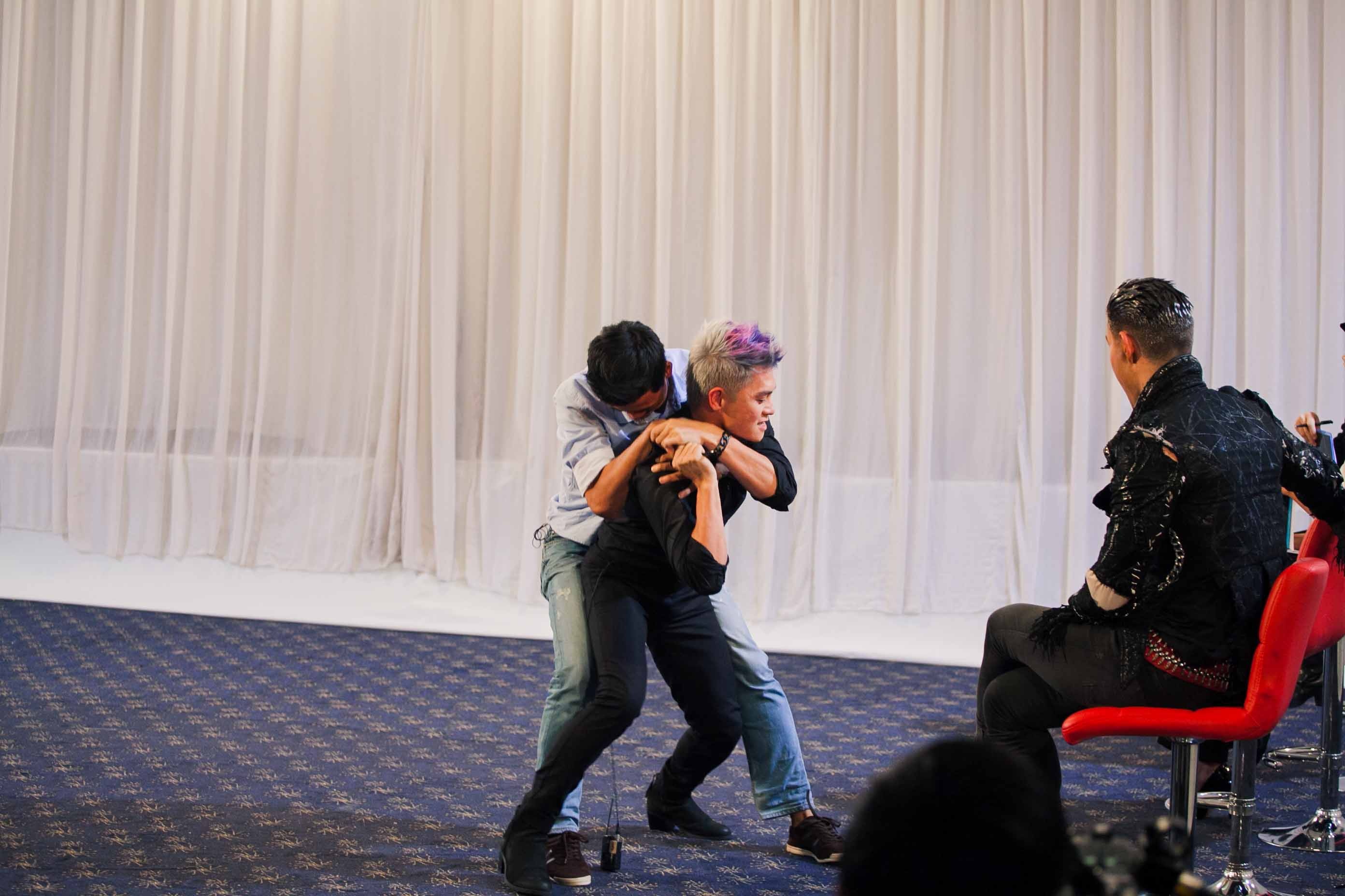 | Nam Trung thử thách thí sinh để buộc anh chàng phải ra tay với mình. Trước tình huống bất ngờ, thí sinh tỏ ra băn khoăn, anh không dám dùng "vũ lực" với vị giám khảo đáng kính. |