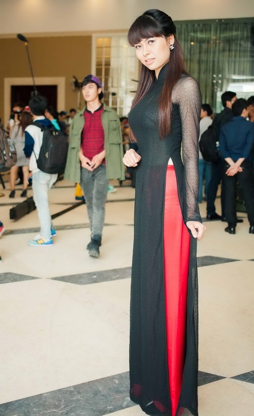 | Cô gái diện trang phục áo dài dân tộc tạo dáng nữ tính. |
