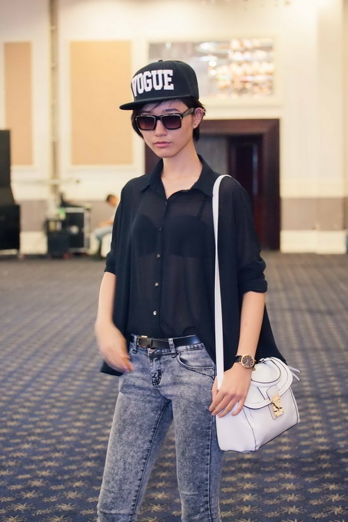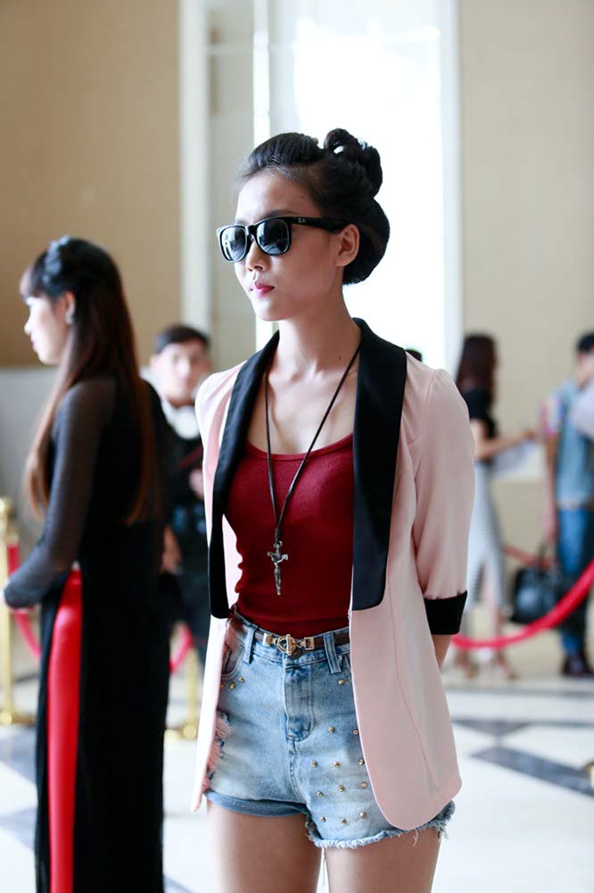 | Thùy Trang tạo dáng ngầu, cô có mặt từ sớm để cổ vũ thí sinh quen biết. |