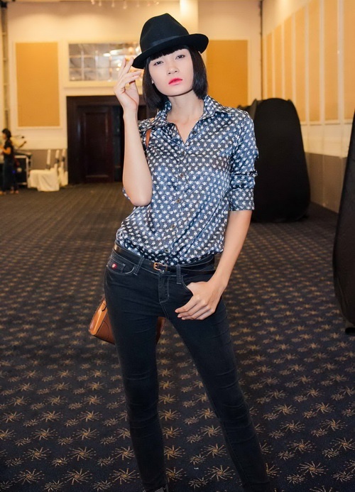 | Á quân Trà My xuất hiện với trang phục cá tính. Cô đến hướng dẫn các thí sinh luyện catwalk. |