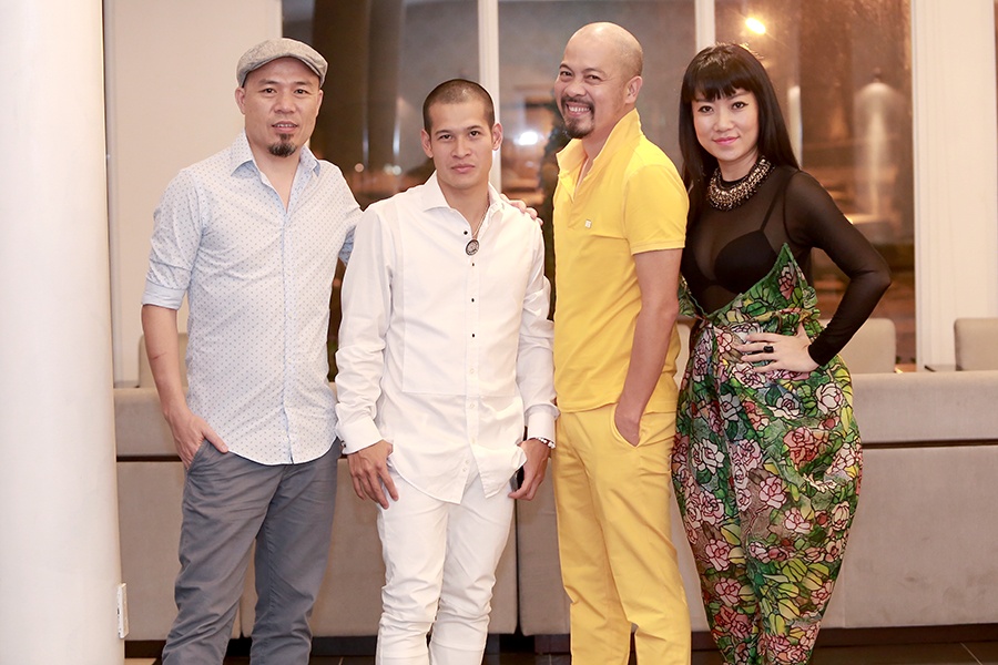 | Hai nhà thiết kế của chương trình Võ Thùy Dương, Đức Hùng chụp hình cùng giám khảo Huy Tuấn, Việt Tú. |