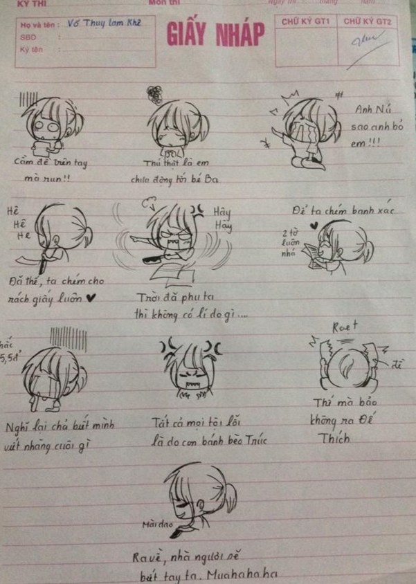Sau giờ thi, các học sinh cấp ba liên tục cập nhật thông tin, chia sẻ cảm nhận về đề Văn lên mạng xã hội. Trong đó nổi lên trường hợp của Võ Thụy Lam Khê, cô gái nhờ những hình ảnh ngộ nghĩnh trong giấy nháp nói hộ nỗi niềm lo lắng vì trót ôn luyện trật tủ môn Văn.