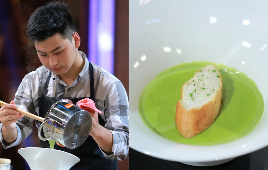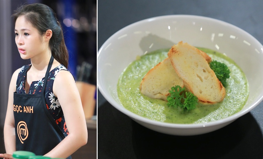 | Ngọc Anh là một trong hai người có món ăn tệ nhất và rơi vào vòng nguy hiểm. Không nhận biết được nguyên liệu, Ngọc Anh chọn khoai tây và lá ngò tây. Lá ngò tây để lại cợn khi xay khiến súp không được mịn. Trong khi đó, nhiều phô mai đã làm món ăn của cô bị át mùi. |