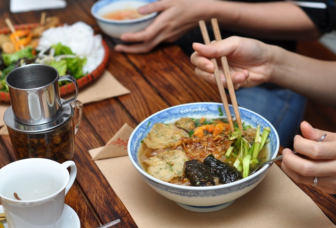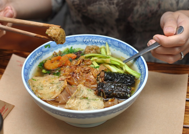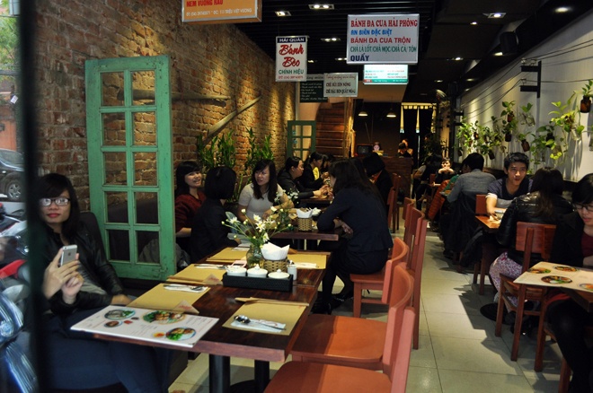 Ở đây có đủ bánh đa cua, bún tôm, nem vuông, sủi dìn, bánh bèo… đúng điệu Hải Phòng. Không gian quán lại rất độc đáo, chẳng “đụng hàng” với bất kì đâu.