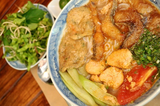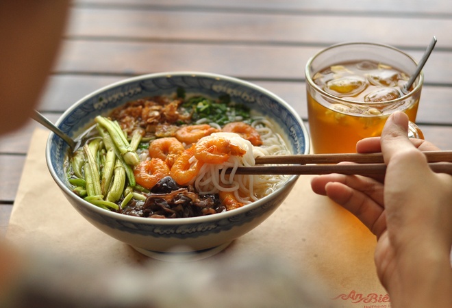 Song đến đây nếu không thưởng thức một bát bún tôm thì quả là lãng phí. Nước canh nóng hổi, ngọt thơm vị nước tôm nguyên chất. Tôm sắt bóc sẵn vỏ tươi ngon, ăn cùng với rau cần, mộc nhĩ, thứ nào cũng giòn giòn, man mát. Thưởng thức hết bát bún đôi khi khách vẫn phải chép miệng, thòm thèm.