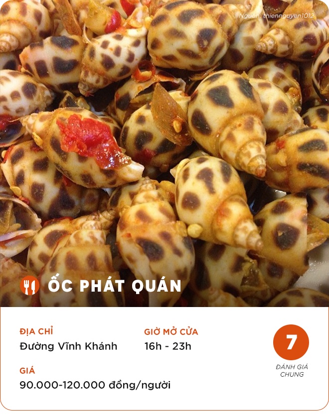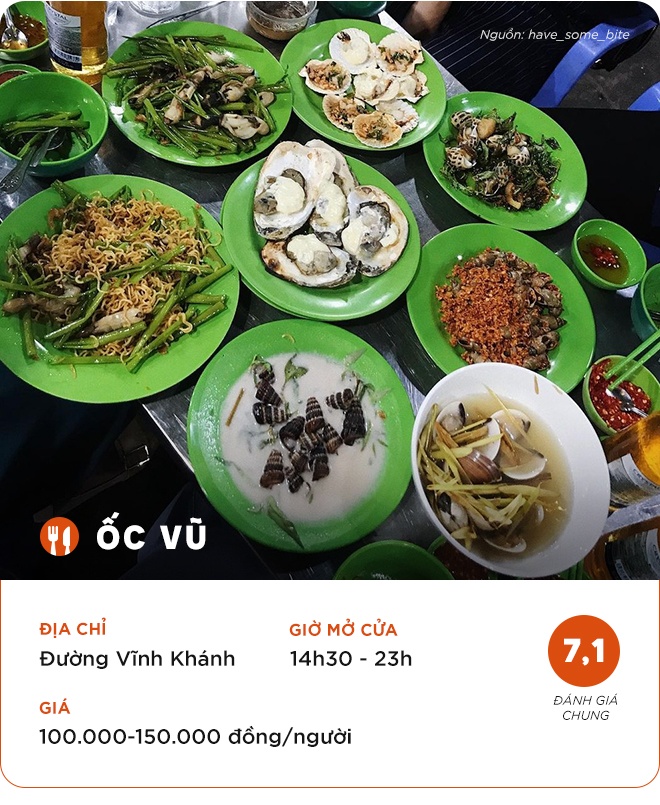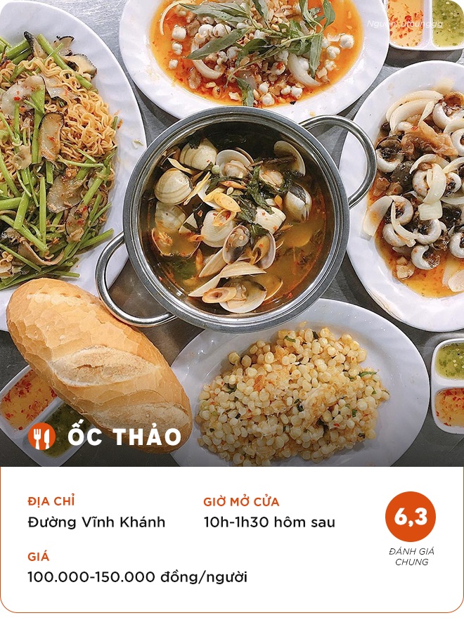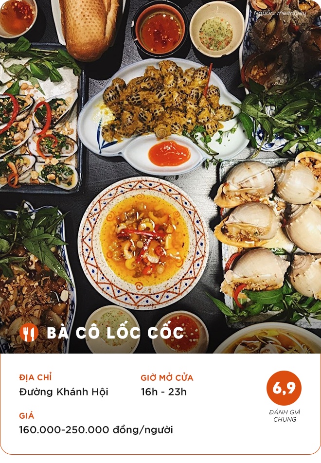 Thanh Tu Nguyen: "Quán này hơi nhỏ và dơ xíu do giá cả bình dân. Ốc khá nhỏ, chế biến đơn giản như luộc, hấp, me, tỏi, rang muối hay nướng mỡ hành... Nghêu ăn ổn, ốc móng tay hơi cát và mặn, sò lông nướng khá ngon. Giữ xe miễn phí nhưng bạn phải kêu quán đưa thẻ. Ốc, nghêu đồng giá 50.000 đồng/ tô".