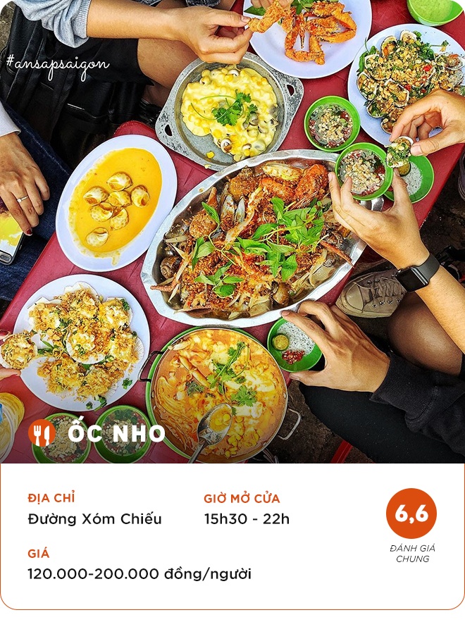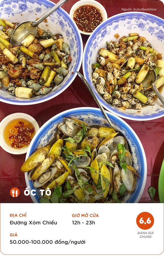 Le Huynh Nhu: "Quận 4 vốn nối tiếng với các quán ốc và ốc tô là một trong số đó. Quán nằm trên đường Xóm Chiếu, mình đi ăn vào buổi tối nên rất đông khách. Không gian quán hẹp, bàn ghế kê sát nhau, lối đi nhỏ. Các món ốc đa dạng, đồng giá 50.000 đồng/tô. Mình đi 2 người ăn 3 tô là no luôn".