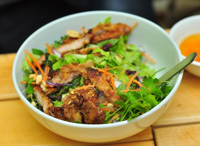 Ấm người với súp cua xong thì đến món bún thịt nướng mát mẻ rất được người Sài Gòn ưa chuộng. Cũng thuộc “họ trộn”, trụng với nhiều rau, giá, lạc, hành… song nếu so với những món bánh đa, miến, phở trộn Hà Thành, món có phần thơm hơn nhờ loại thịt đã tẩm ướp rồi nướng than hoa tới khi cháy cạnh. Món ăn không quá đặc biệt nhưng dễ thưởng thức, dễ hợp khẩu vị mọi người.