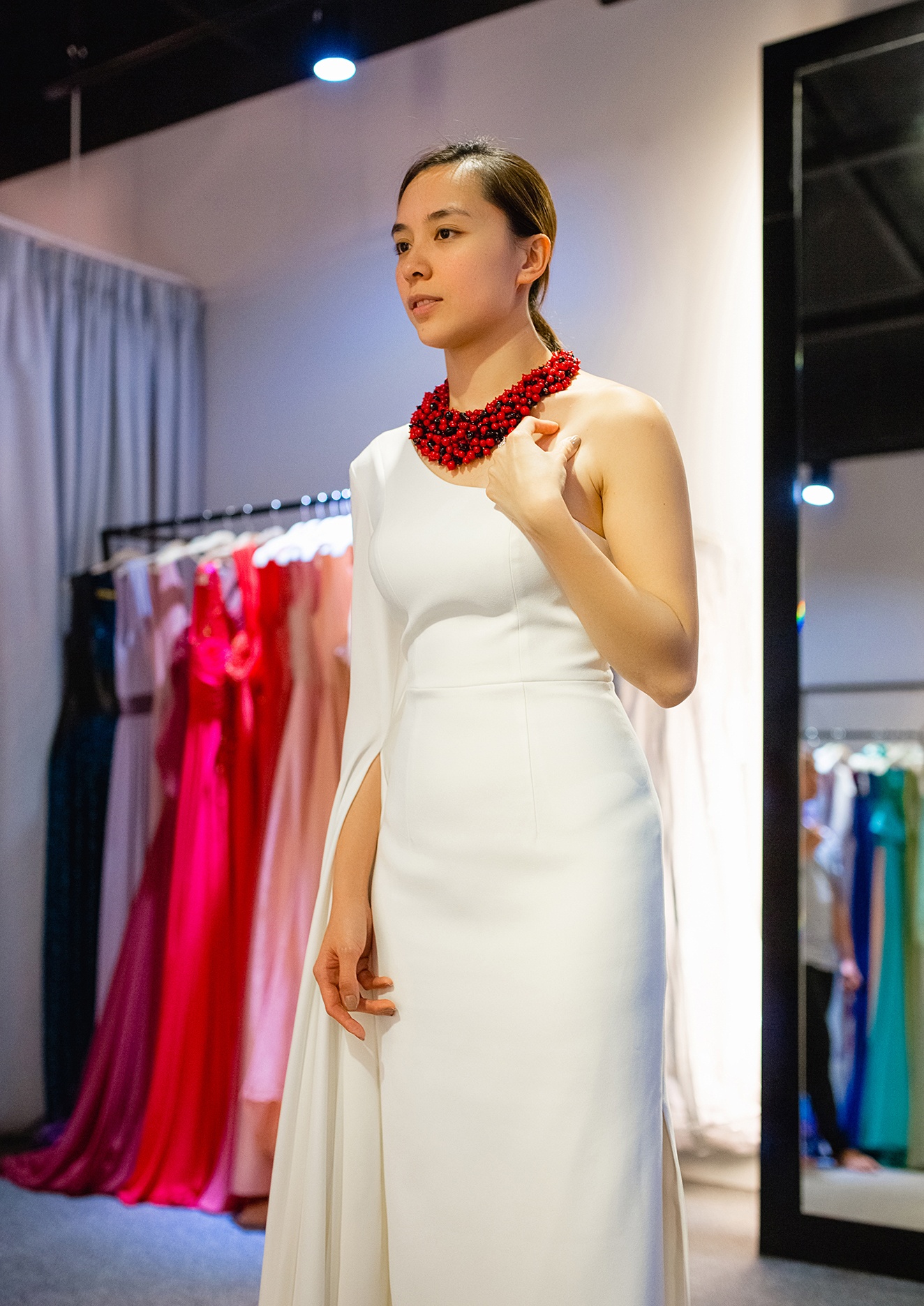 | Đến thử đồ cùng Thiên Lý còn có Hoa hậu quý bà Thu Hoài. Nữ doanh nhân ướm những thiết kế dạng yếm gợi cảm. |