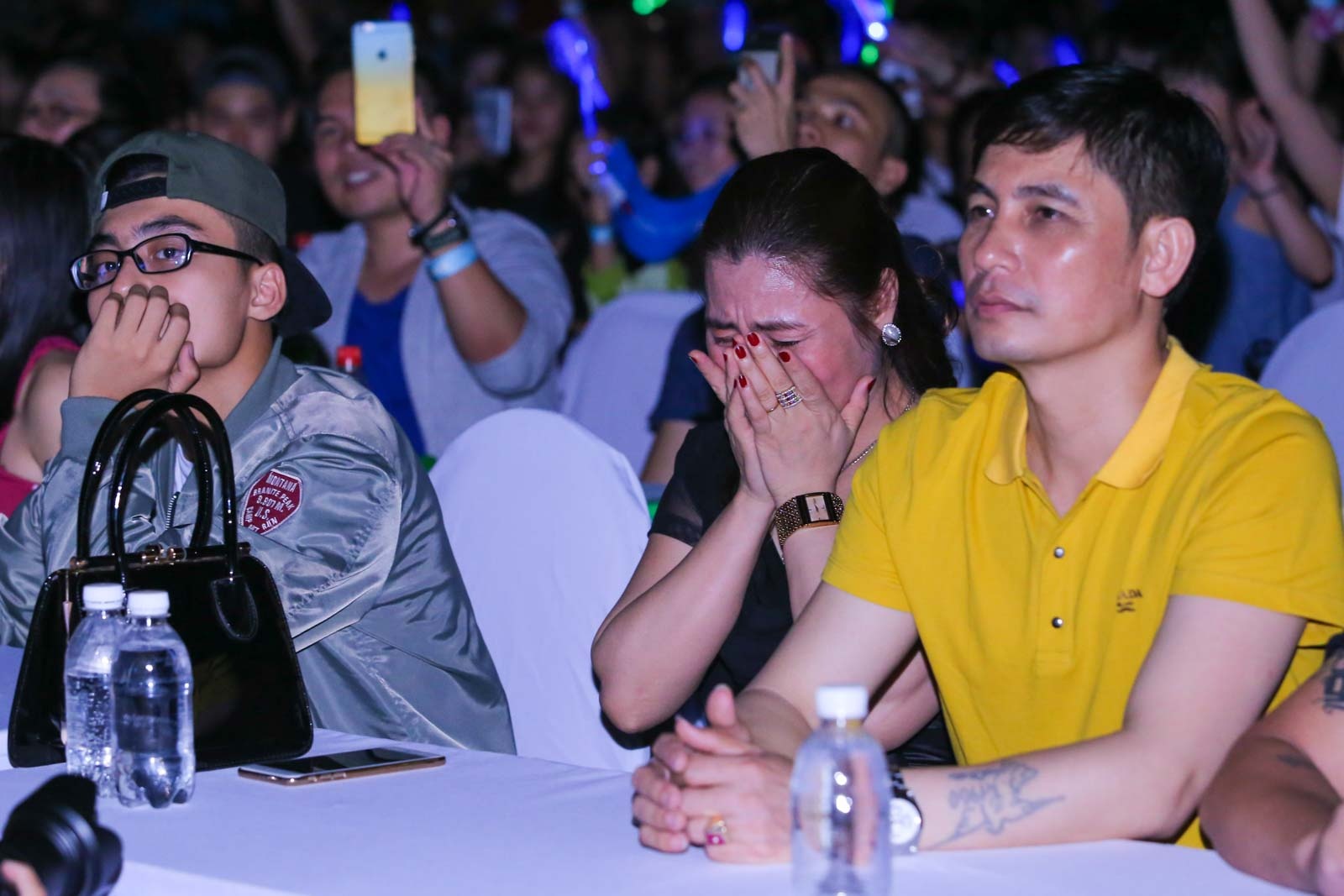 | Khi Cơn mưa ngang qua của Sơn Tùng được khán giả biết tới và yêu mến, bố mẹ vẫn muốn anh học kinh doanh chứ không phải âm nhạc vì sợ con đường này không bền lâu. Trong ảnh, mẹ của nam ca sĩ bật khóc khi theo dõi con biểu diễn trên sân khấu. Em trai cũng mới từ Thái Bình vào Sài Gòn để cổ vũ Sơn Tùng M-TP. |